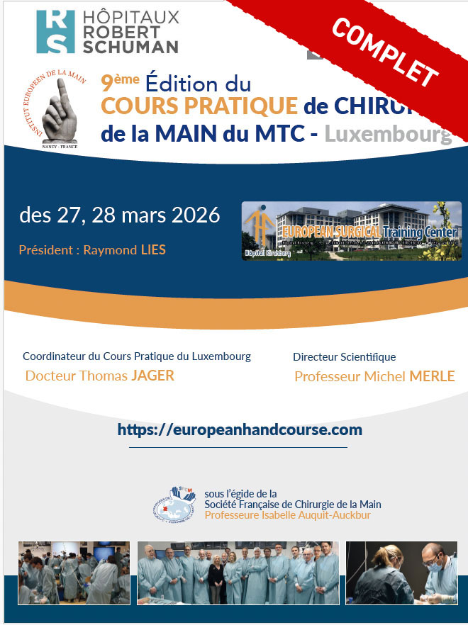 La 9ème Edition du Cours Pratique de Chirurgie de la Main de l’Institut Européen de la Main Nancy-Luxembourg se déroulera les 27 et 28 mars 2026 dans les magnifiques locaux du Medical Training Center de l’Hôpital Kirchberg à Luxembourg, sous l’égide de la Société Française de Chirurgie de la Main présidée par Isabelle Auquit-Auckbur.